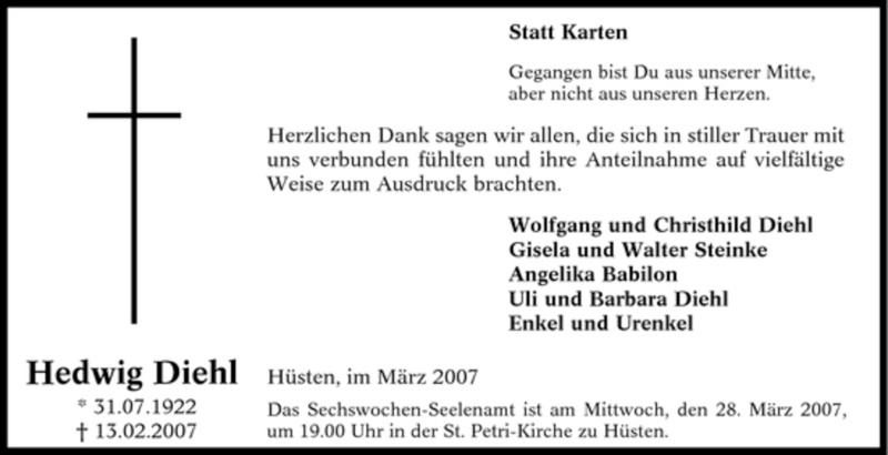 Hier finden Sie alle Traueranzeigen aus der Zeitung, die bisher für Hedwig Diehl erschienen sind. Weitere Traueranzeigen, die in der Zeitung erscheinen, werden hier ebenfalls aufgelistet