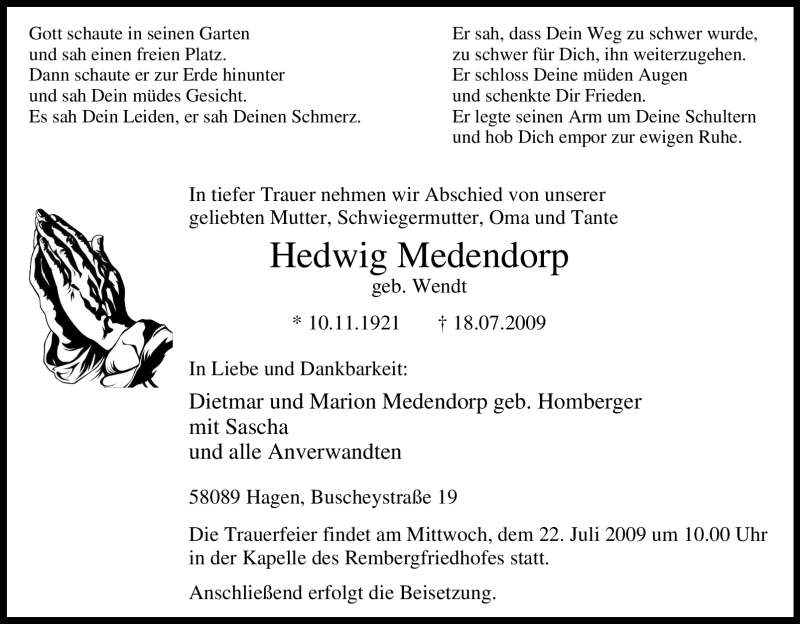 Hier finden Sie alle Traueranzeigen aus der Zeitung, die bisher für Hedwig Medendorp erschienen sind. Weitere Traueranzeigen, die in der Zeitung erscheinen, werden hier ebenfalls aufgelistet
