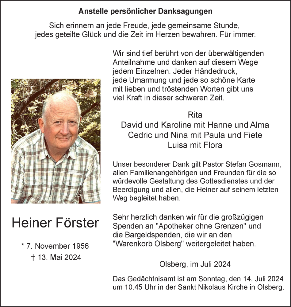 Hier finden Sie alle Traueranzeigen aus der Zeitung, die bisher für Heiner Förster erschienen sind. Weitere Traueranzeigen, die in der Zeitung erscheinen, werden hier ebenfalls aufgelistet