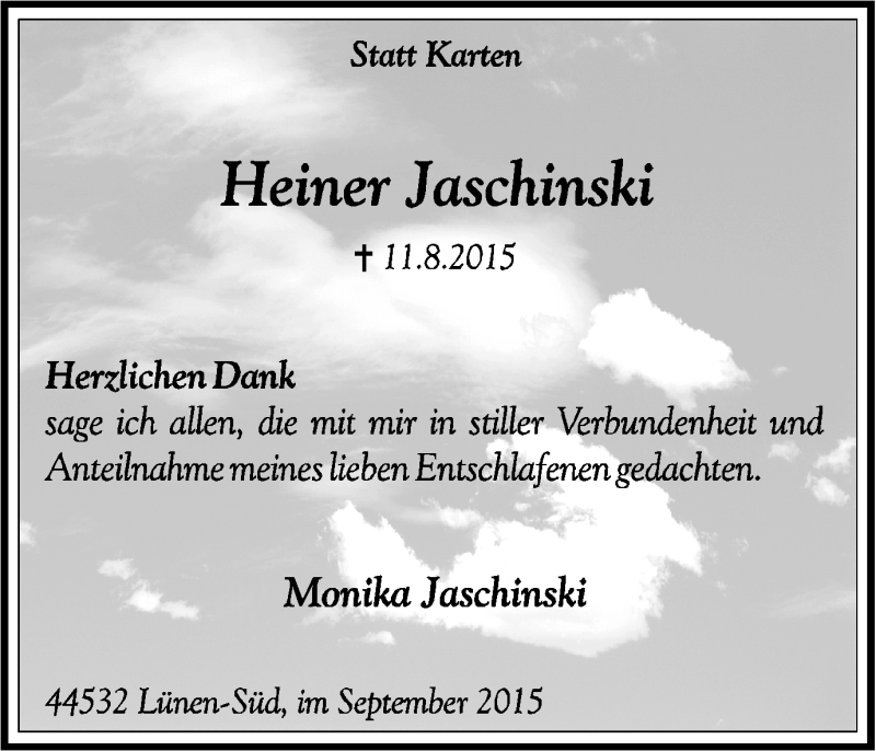 Hier finden Sie alle Traueranzeigen aus der Zeitung, die bisher für Heiner Jaschinski erschienen sind. Weitere Traueranzeigen, die in der Zeitung erscheinen, werden hier ebenfalls aufgelistet