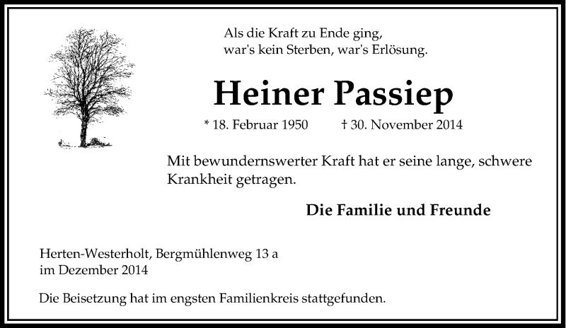 Hier finden Sie alle Traueranzeigen aus der Zeitung, die bisher für Heiner Passiep erschienen sind. Weitere Traueranzeigen, die in der Zeitung erscheinen, werden hier ebenfalls aufgelistet