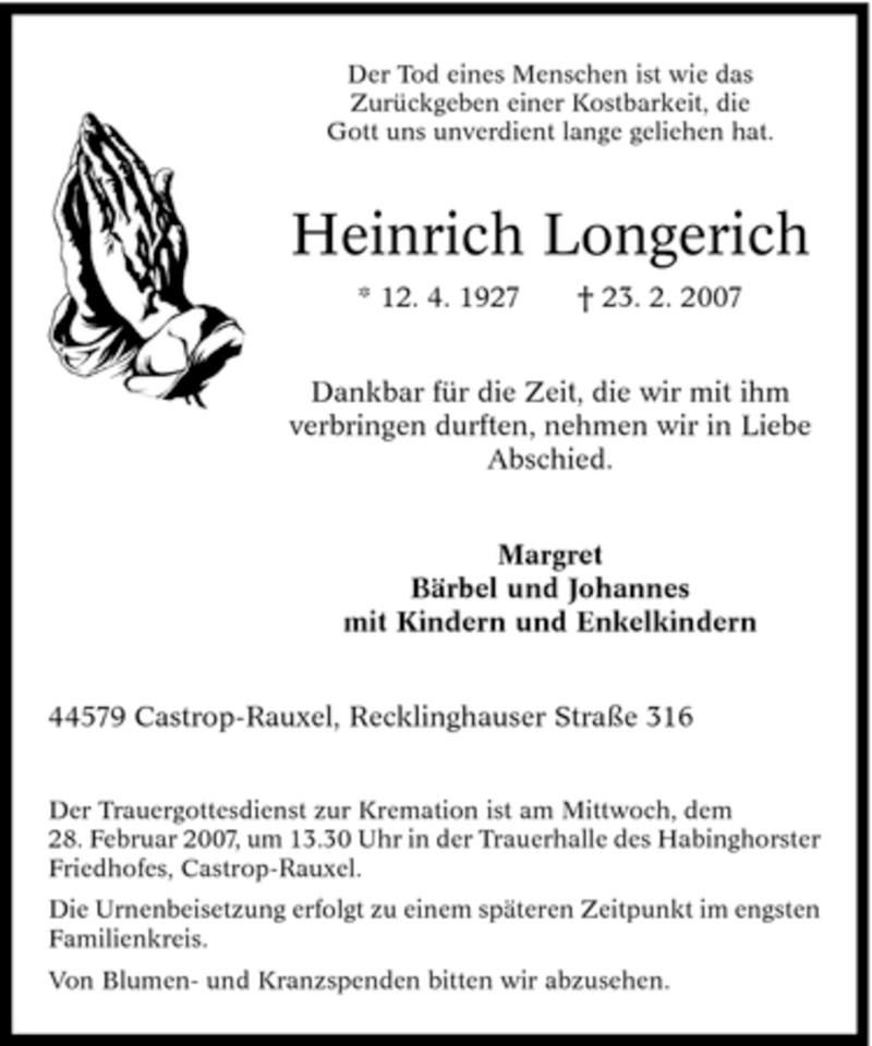 Hier finden Sie alle Traueranzeigen aus der Zeitung, die bisher für Heinrich Longerich erschienen sind. Weitere Traueranzeigen, die in der Zeitung erscheinen, werden hier ebenfalls aufgelistet