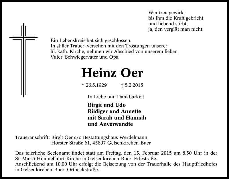 Hier finden Sie alle Traueranzeigen aus der Zeitung, die bisher für Heinz Oer erschienen sind. Weitere Traueranzeigen, die in der Zeitung erscheinen, werden hier ebenfalls aufgelistet