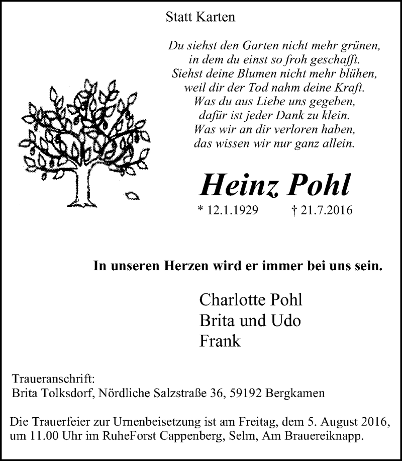 Hier finden Sie alle Traueranzeigen aus der Zeitung, die bisher für Heinz Pohl erschienen sind. Weitere Traueranzeigen, die in der Zeitung erscheinen, werden hier ebenfalls aufgelistet