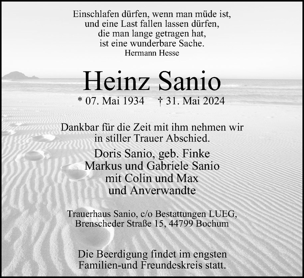 Hier finden Sie alle Traueranzeigen aus der Zeitung, die bisher für Heinz Sanio erschienen sind. Weitere Traueranzeigen, die in der Zeitung erscheinen, werden hier ebenfalls aufgelistet