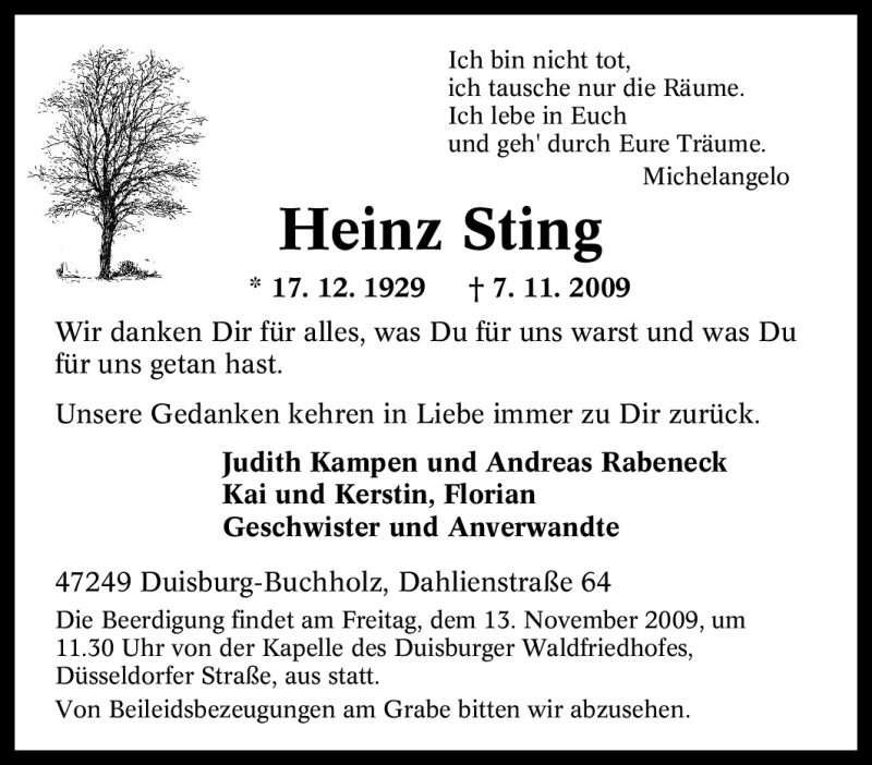 Hier finden Sie alle Traueranzeigen aus der Zeitung, die bisher für Heinz Sting erschienen sind. Weitere Traueranzeigen, die in der Zeitung erscheinen, werden hier ebenfalls aufgelistet