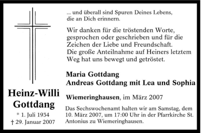 Hier finden Sie alle Traueranzeigen aus der Zeitung, die bisher für Heinz-Willi Gottdang erschienen sind. Weitere Traueranzeigen, die in der Zeitung erscheinen, werden hier ebenfalls aufgelistet