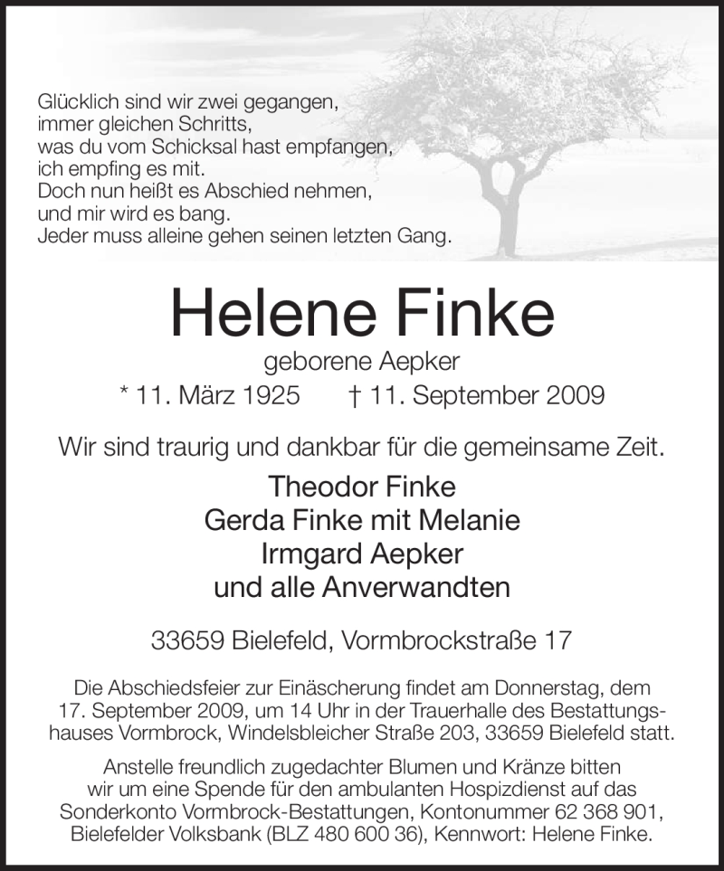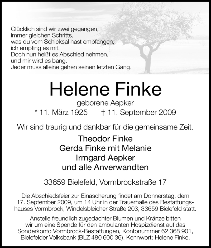 Hier finden Sie alle Traueranzeigen aus der Zeitung, die bisher für Helene Finke erschienen sind. Weitere Traueranzeigen, die in der Zeitung erscheinen, werden hier ebenfalls aufgelistet