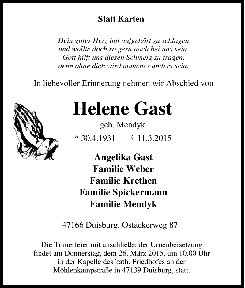 Hier finden Sie alle Traueranzeigen aus der Zeitung, die bisher für Helene Gast erschienen sind. Weitere Traueranzeigen, die in der Zeitung erscheinen, werden hier ebenfalls aufgelistet