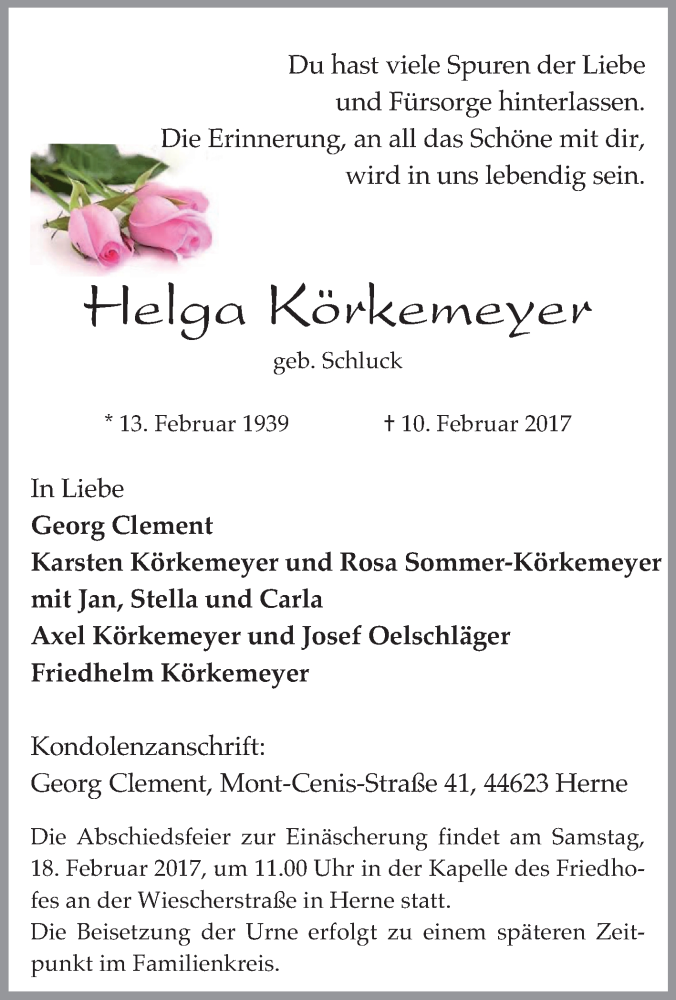 Hier finden Sie alle Traueranzeigen aus der Zeitung, die bisher für Helga Körkemeyer erschienen sind. Weitere Traueranzeigen, die in der Zeitung erscheinen, werden hier ebenfalls aufgelistet