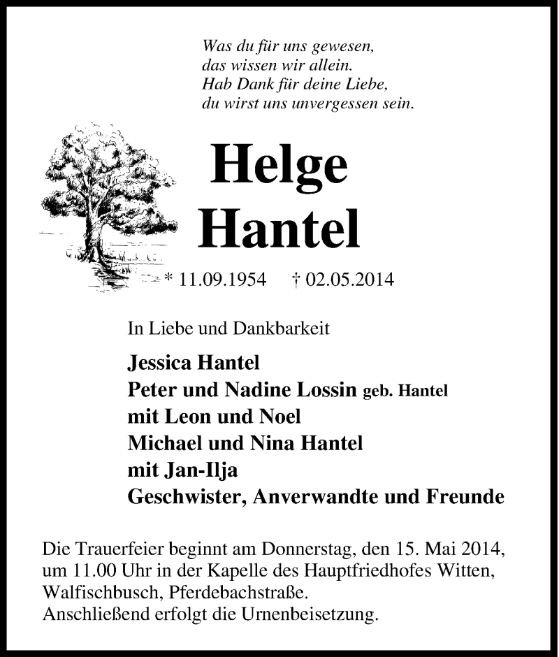 Hier finden Sie alle Traueranzeigen aus der Zeitung, die bisher für Helge Hantel erschienen sind. Weitere Traueranzeigen, die in der Zeitung erscheinen, werden hier ebenfalls aufgelistet