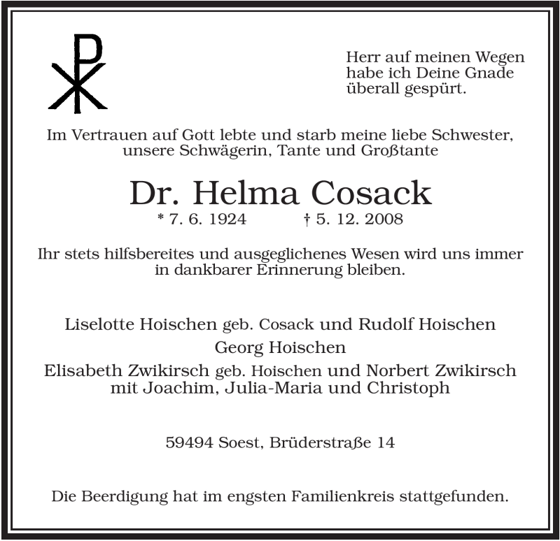 Hier finden Sie alle Traueranzeigen aus der Zeitung, die bisher für Helma Cosack erschienen sind. Weitere Traueranzeigen, die in der Zeitung erscheinen, werden hier ebenfalls aufgelistet
