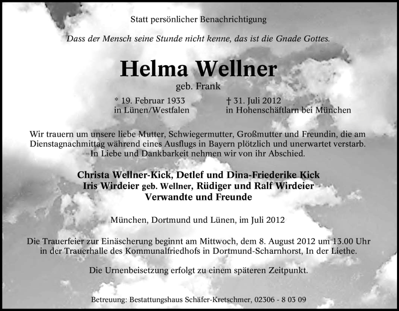 Hier finden Sie alle Traueranzeigen aus der Zeitung, die bisher für Helma Wellner erschienen sind. Weitere Traueranzeigen, die in der Zeitung erscheinen, werden hier ebenfalls aufgelistet