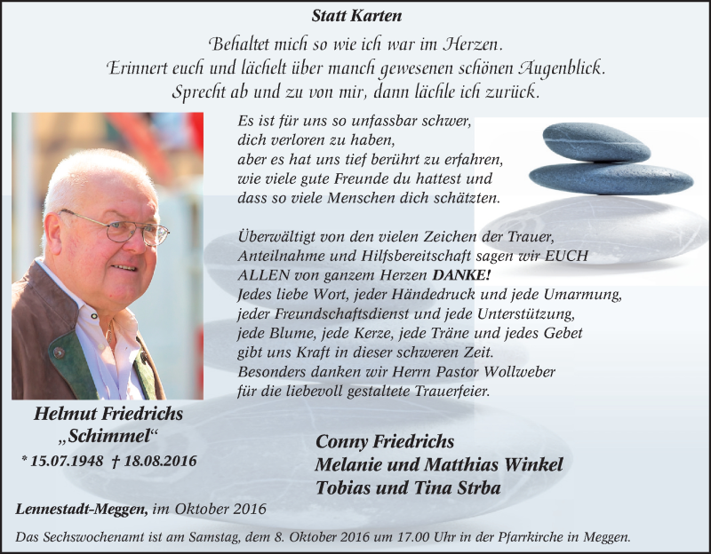 Hier finden Sie alle Traueranzeigen aus der Zeitung, die bisher für Helmut Friedrichs erschienen sind. Weitere Traueranzeigen, die in der Zeitung erscheinen, werden hier ebenfalls aufgelistet
