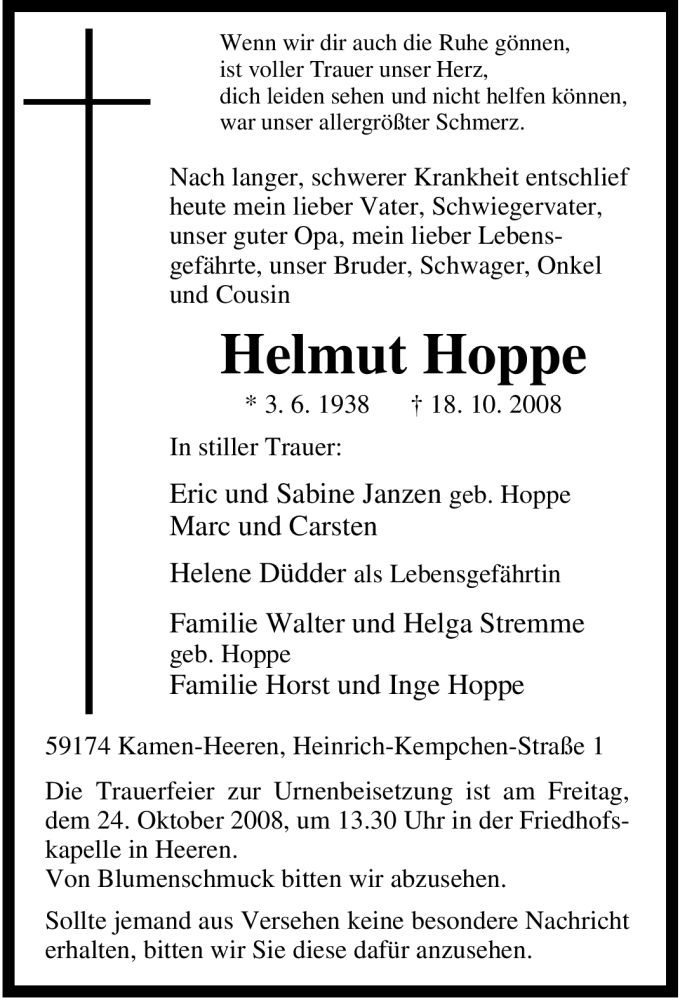 Hier finden Sie alle Traueranzeigen aus der Zeitung, die bisher für Helmut Hoppe erschienen sind. Weitere Traueranzeigen, die in der Zeitung erscheinen, werden hier ebenfalls aufgelistet