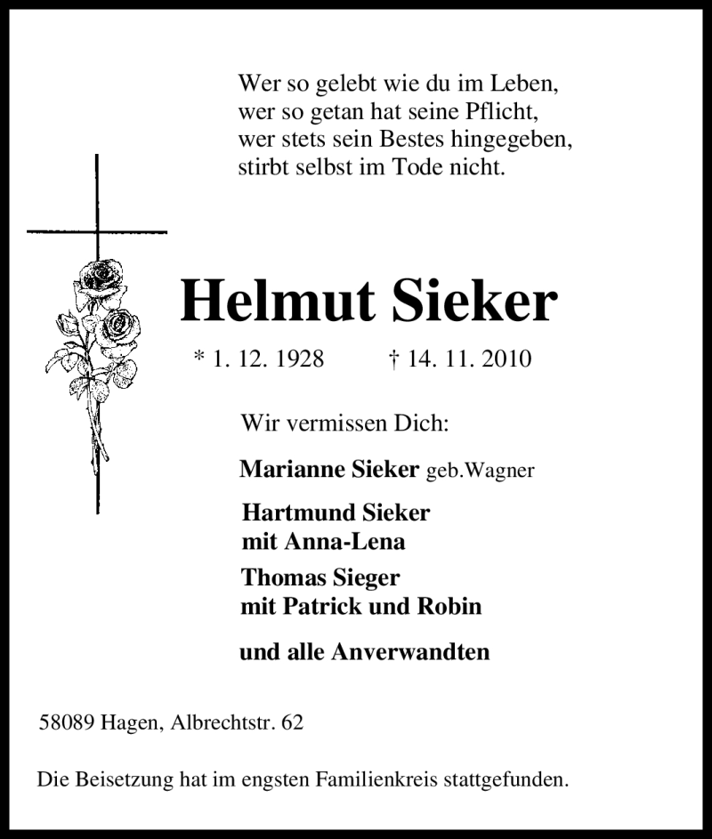 Hier finden Sie alle Traueranzeigen aus der Zeitung, die bisher für Helmut Sieker erschienen sind. Weitere Traueranzeigen, die in der Zeitung erscheinen, werden hier ebenfalls aufgelistet