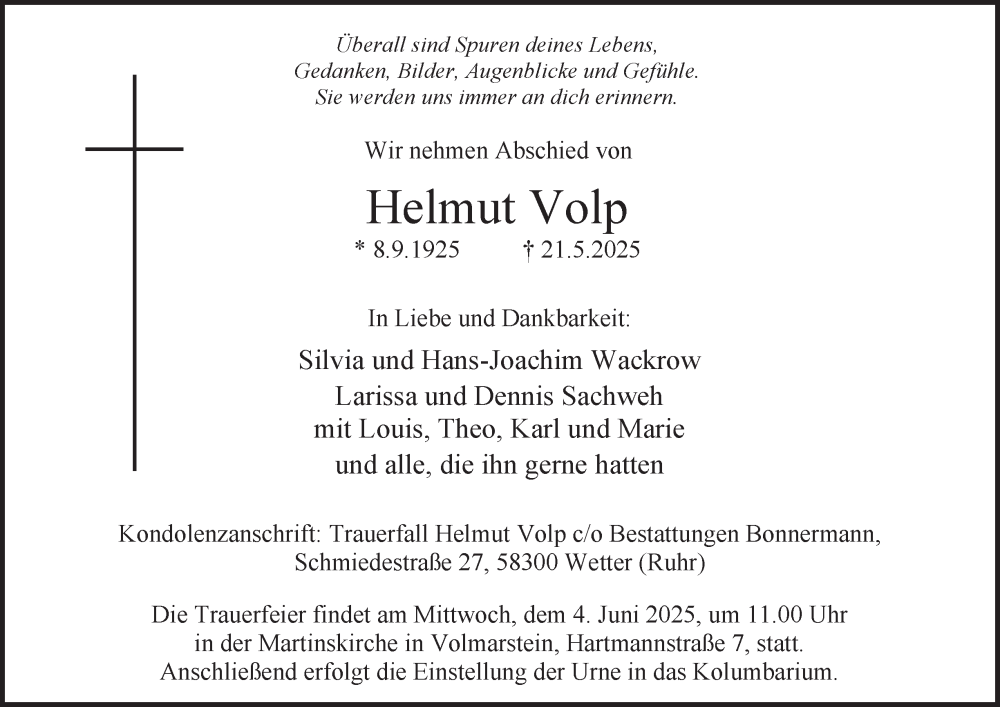 Hier finden Sie alle Traueranzeigen aus der Zeitung, die bisher für Helmut Volp erschienen sind. Weitere Traueranzeigen, die in der Zeitung erscheinen, werden hier ebenfalls aufgelistet