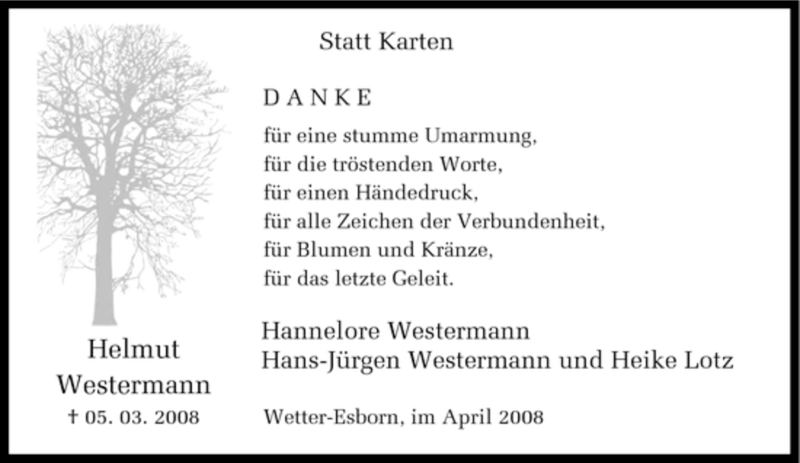 Hier finden Sie alle Traueranzeigen aus der Zeitung, die bisher für Helmut Westermann erschienen sind. Weitere Traueranzeigen, die in der Zeitung erscheinen, werden hier ebenfalls aufgelistet
