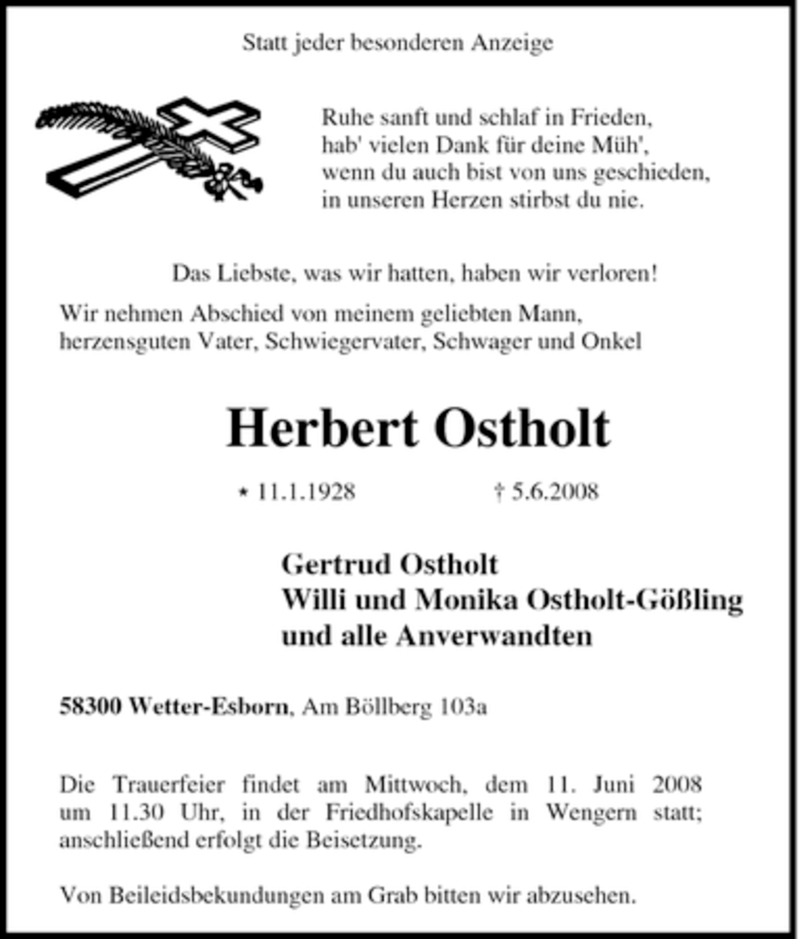 Hier finden Sie alle Traueranzeigen aus der Zeitung, die bisher für Herbert Ostholt erschienen sind. Weitere Traueranzeigen, die in der Zeitung erscheinen, werden hier ebenfalls aufgelistet