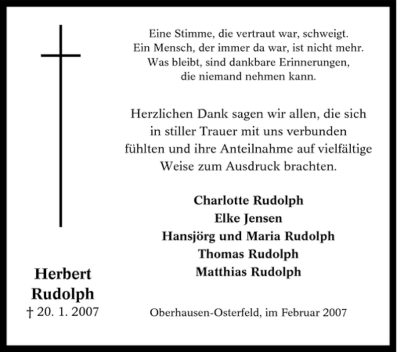 Hier finden Sie alle Traueranzeigen aus der Zeitung, die bisher für Herbert Rudolph erschienen sind. Weitere Traueranzeigen, die in der Zeitung erscheinen, werden hier ebenfalls aufgelistet