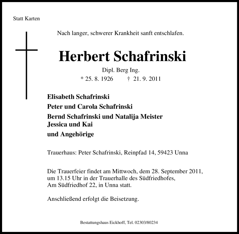 Hier finden Sie alle Traueranzeigen aus der Zeitung, die bisher für Herbert Schafrinski erschienen sind. Weitere Traueranzeigen, die in der Zeitung erscheinen, werden hier ebenfalls aufgelistet