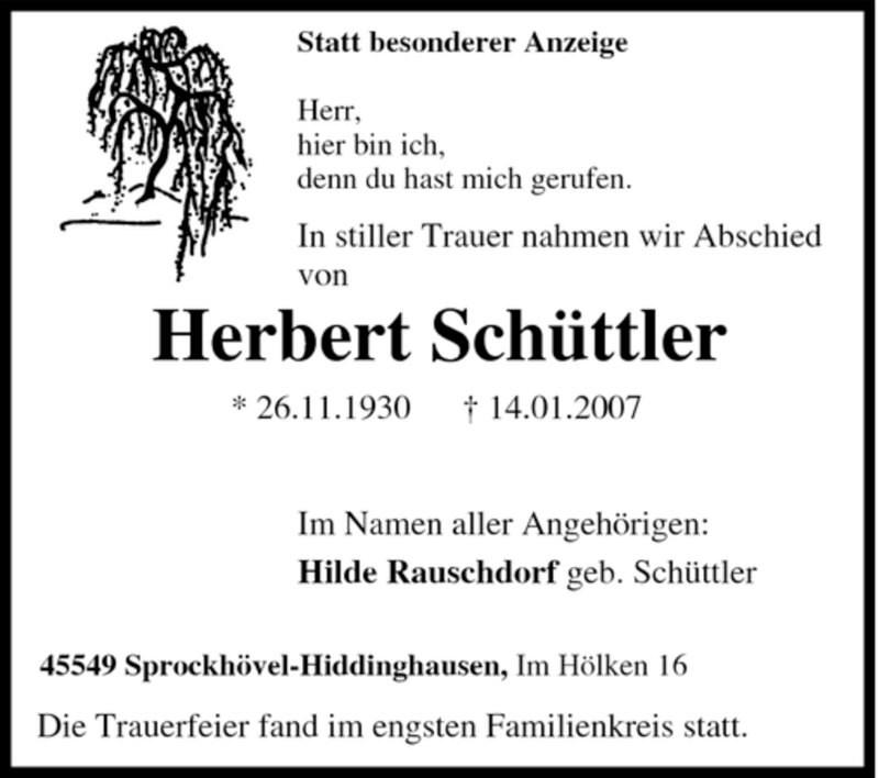 Hier finden Sie alle Traueranzeigen aus der Zeitung, die bisher für Herbert Schüttler erschienen sind. Weitere Traueranzeigen, die in der Zeitung erscheinen, werden hier ebenfalls aufgelistet