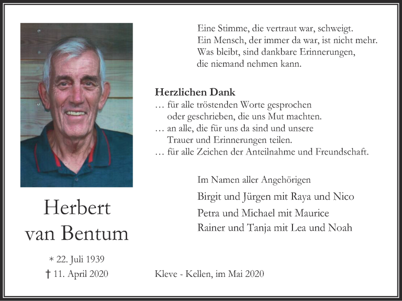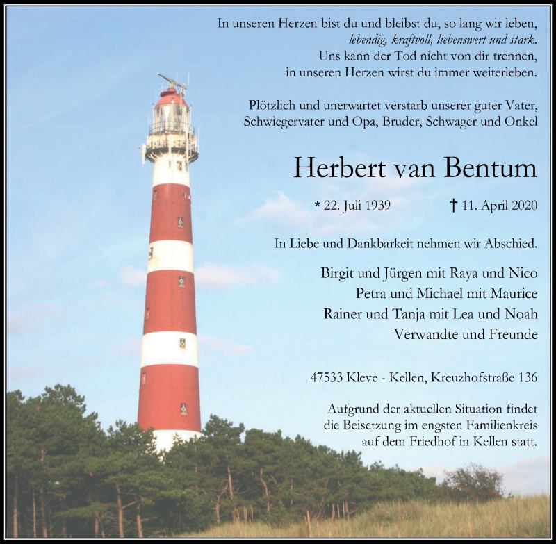 Hier finden Sie alle Traueranzeigen aus der Zeitung, die bisher für Herbert van Bentum erschienen sind. Weitere Traueranzeigen, die in der Zeitung erscheinen, werden hier ebenfalls aufgelistet