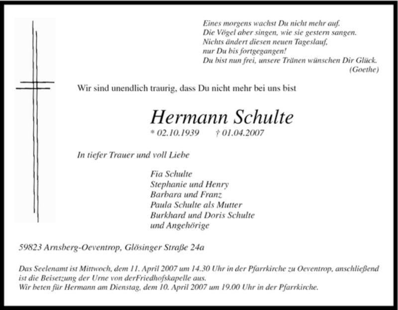 Hier finden Sie alle Traueranzeigen aus der Zeitung, die bisher für Hermann Schulte erschienen sind. Weitere Traueranzeigen, die in der Zeitung erscheinen, werden hier ebenfalls aufgelistet