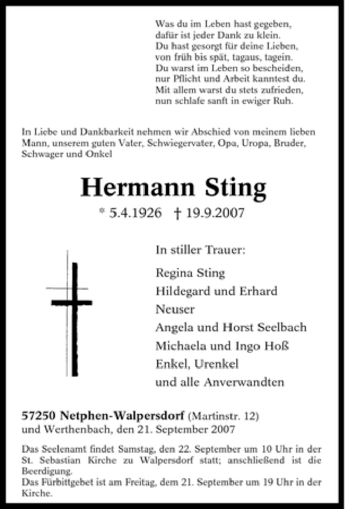 Hier finden Sie alle Traueranzeigen aus der Zeitung, die bisher für Hermann Sting erschienen sind. Weitere Traueranzeigen, die in der Zeitung erscheinen, werden hier ebenfalls aufgelistet