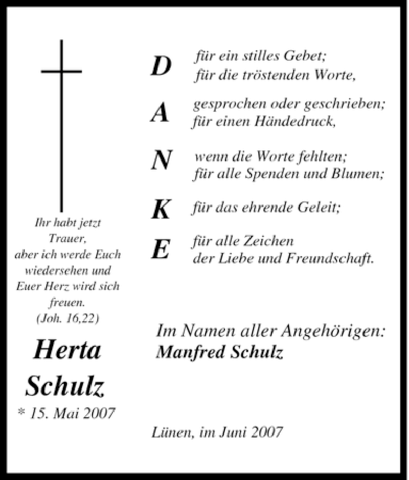 Hier finden Sie alle Traueranzeigen aus der Zeitung, die bisher für Herta Schulz erschienen sind. Weitere Traueranzeigen, die in der Zeitung erscheinen, werden hier ebenfalls aufgelistet