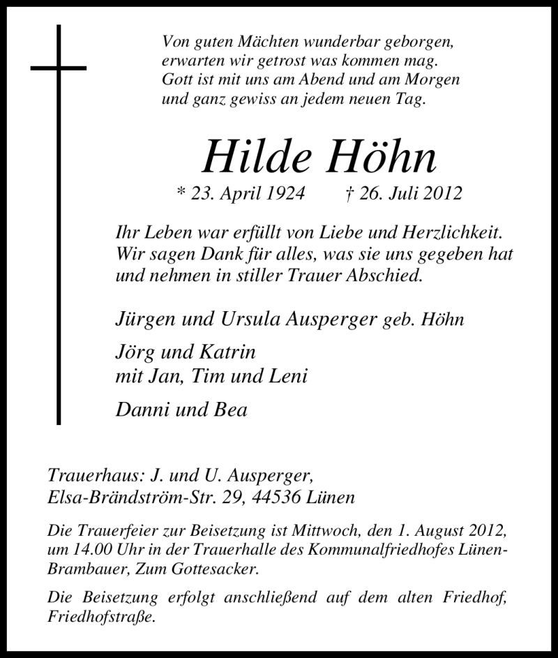 Hier finden Sie alle Traueranzeigen aus der Zeitung, die bisher für Hilde Höhn erschienen sind. Weitere Traueranzeigen, die in der Zeitung erscheinen, werden hier ebenfalls aufgelistet