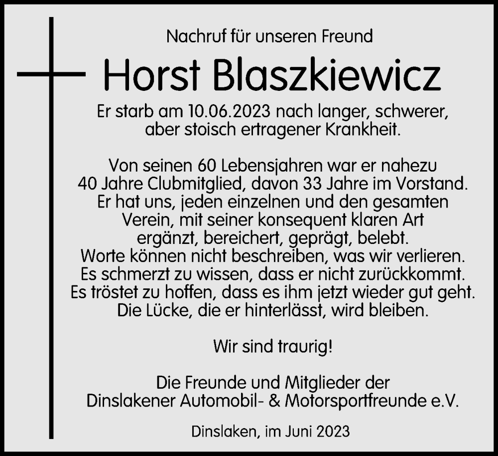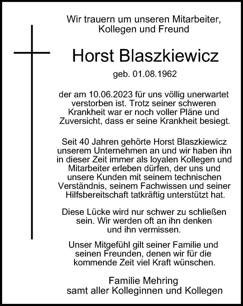 Hier finden Sie alle Traueranzeigen aus der Zeitung, die bisher für Horst Blaszkiewicz erschienen sind. Weitere Traueranzeigen, die in der Zeitung erscheinen, werden hier ebenfalls aufgelistet