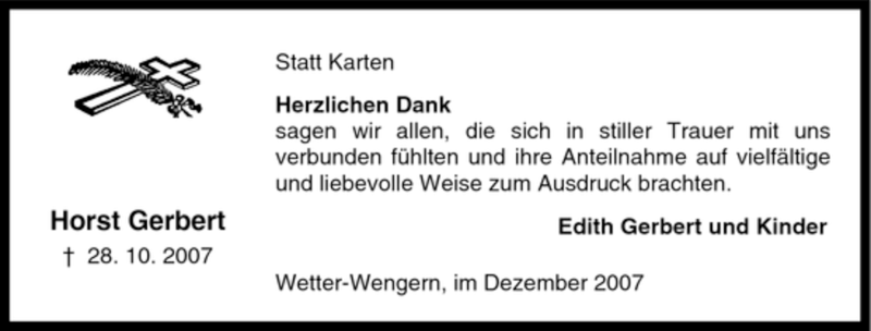 Hier finden Sie alle Traueranzeigen aus der Zeitung, die bisher für Horst Gerbert erschienen sind. Weitere Traueranzeigen, die in der Zeitung erscheinen, werden hier ebenfalls aufgelistet