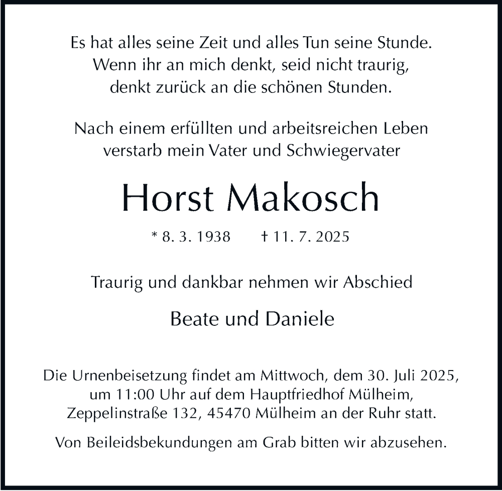 Hier finden Sie alle Traueranzeigen aus der Zeitung, die bisher für Horst Makosch erschienen sind. Weitere Traueranzeigen, die in der Zeitung erscheinen, werden hier ebenfalls aufgelistet