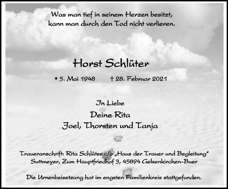 Hier finden Sie alle Traueranzeigen aus der Zeitung, die bisher für Horst Schlüter erschienen sind. Weitere Traueranzeigen, die in der Zeitung erscheinen, werden hier ebenfalls aufgelistet