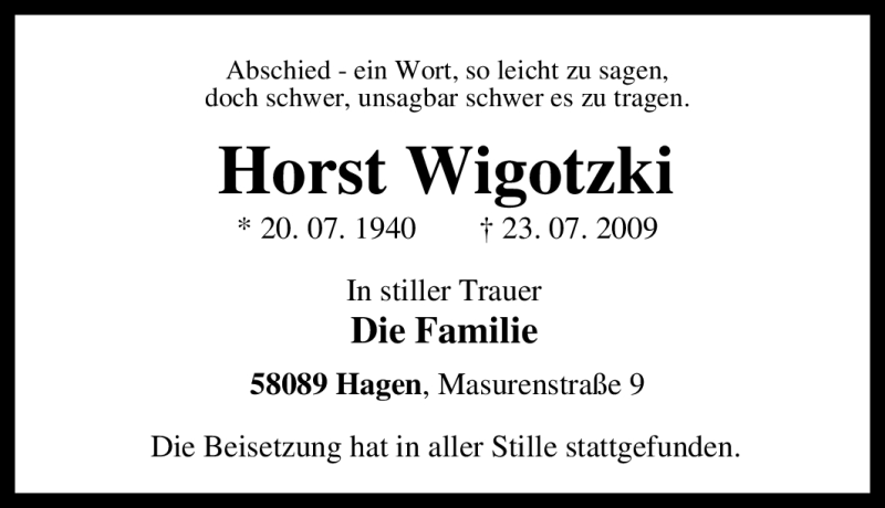Hier finden Sie alle Traueranzeigen aus der Zeitung, die bisher für Horst Wigotzki erschienen sind. Weitere Traueranzeigen, die in der Zeitung erscheinen, werden hier ebenfalls aufgelistet