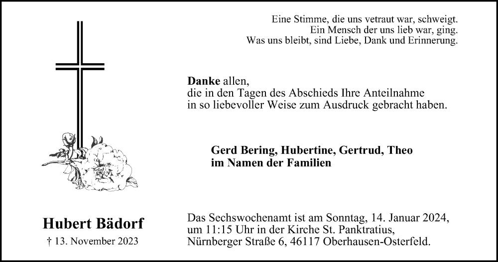 Hier finden Sie alle Traueranzeigen aus der Zeitung, die bisher für Hubert Bädorf erschienen sind. Weitere Traueranzeigen, die in der Zeitung erscheinen, werden hier ebenfalls aufgelistet