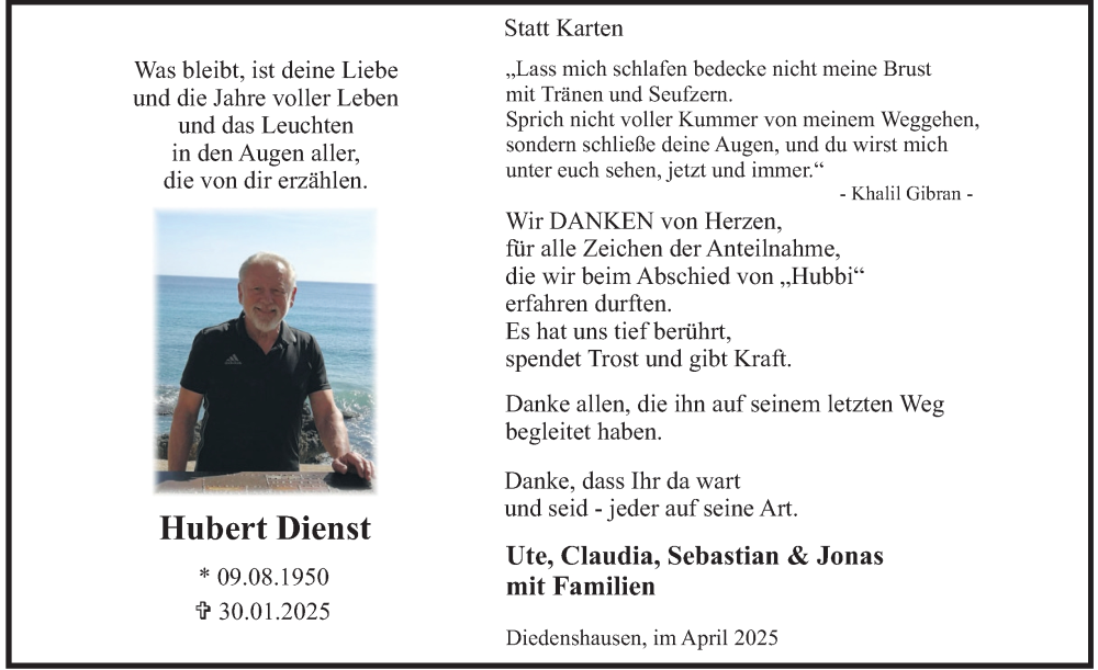Hier finden Sie alle Traueranzeigen aus der Zeitung, die bisher für Hubert Dienst erschienen sind. Weitere Traueranzeigen, die in der Zeitung erscheinen, werden hier ebenfalls aufgelistet