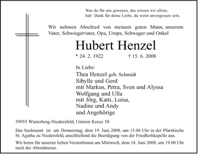 Hier finden Sie alle Traueranzeigen aus der Zeitung, die bisher für Hubert Henzel erschienen sind. Weitere Traueranzeigen, die in der Zeitung erscheinen, werden hier ebenfalls aufgelistet