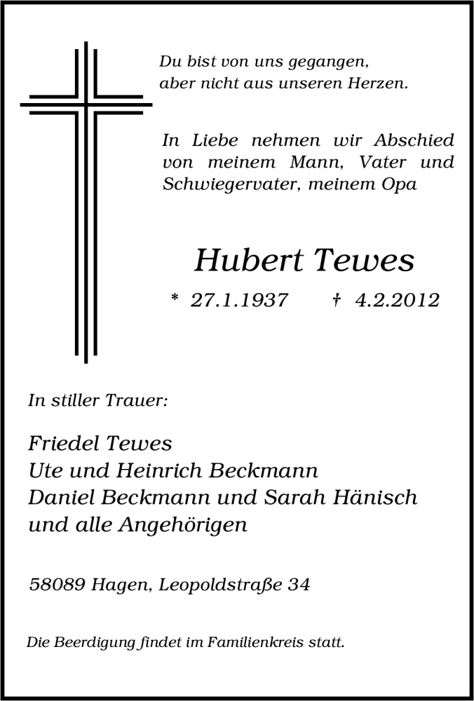 Hier finden Sie alle Traueranzeigen aus der Zeitung, die bisher für Hubert Tewes erschienen sind. Weitere Traueranzeigen, die in der Zeitung erscheinen, werden hier ebenfalls aufgelistet