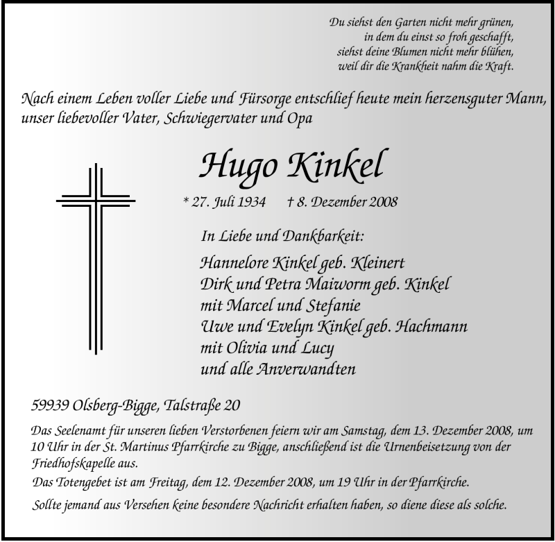 Hier finden Sie alle Traueranzeigen aus der Zeitung, die bisher für Hugo Kinkel erschienen sind. Weitere Traueranzeigen, die in der Zeitung erscheinen, werden hier ebenfalls aufgelistet