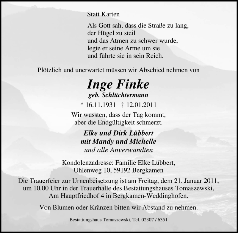 Hier finden Sie alle Traueranzeigen aus der Zeitung, die bisher für Inge Finke erschienen sind. Weitere Traueranzeigen, die in der Zeitung erscheinen, werden hier ebenfalls aufgelistet