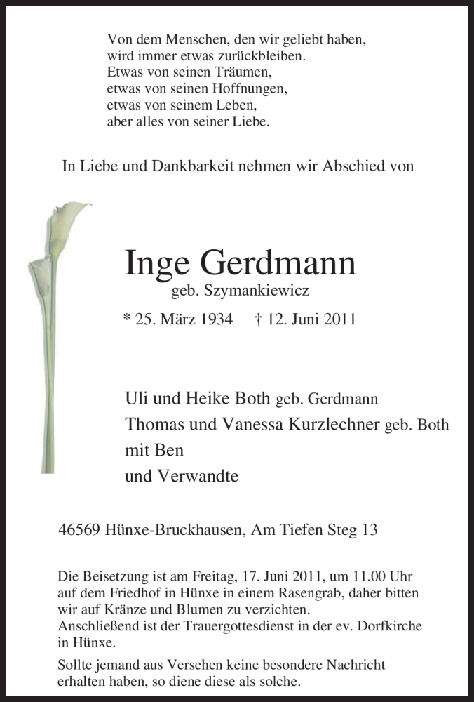 Hier finden Sie alle Traueranzeigen aus der Zeitung, die bisher für Inge Gerdmann erschienen sind. Weitere Traueranzeigen, die in der Zeitung erscheinen, werden hier ebenfalls aufgelistet