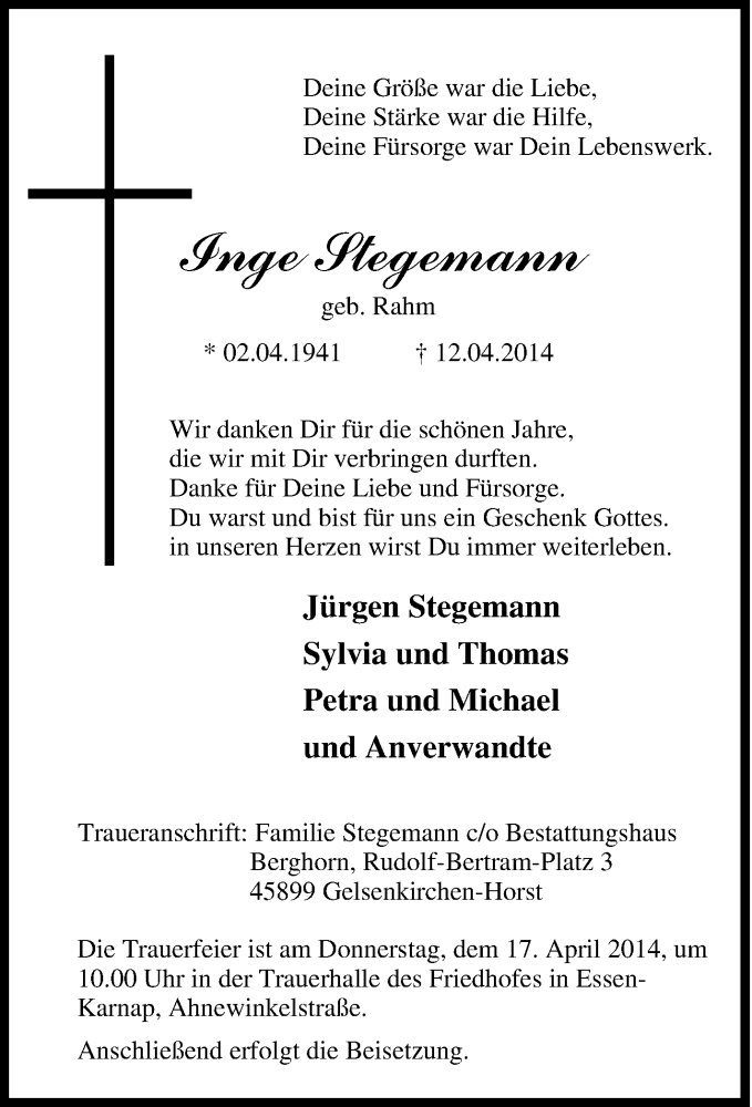Hier finden Sie alle Traueranzeigen aus der Zeitung, die bisher für Inge Stegemann erschienen sind. Weitere Traueranzeigen, die in der Zeitung erscheinen, werden hier ebenfalls aufgelistet