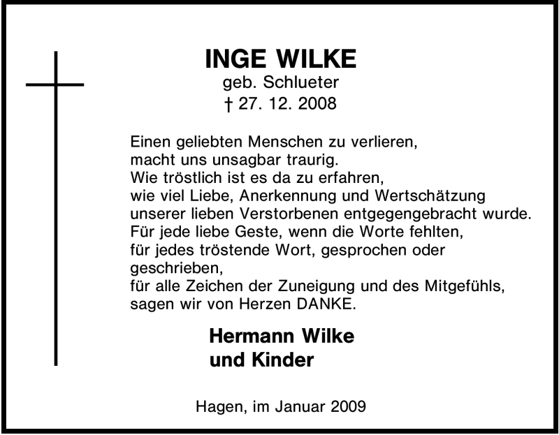 Hier finden Sie alle Traueranzeigen aus der Zeitung, die bisher für Inge Wilke erschienen sind. Weitere Traueranzeigen, die in der Zeitung erscheinen, werden hier ebenfalls aufgelistet