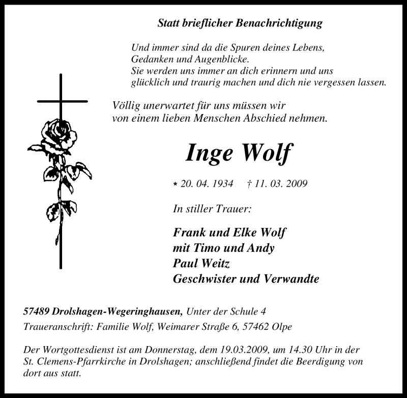 Hier finden Sie alle Traueranzeigen aus der Zeitung, die bisher für Inge Wolf erschienen sind. Weitere Traueranzeigen, die in der Zeitung erscheinen, werden hier ebenfalls aufgelistet