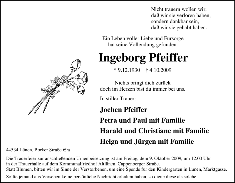 Hier finden Sie alle Traueranzeigen aus der Zeitung, die bisher für Ingeborg Pfeiffer erschienen sind. Weitere Traueranzeigen, die in der Zeitung erscheinen, werden hier ebenfalls aufgelistet