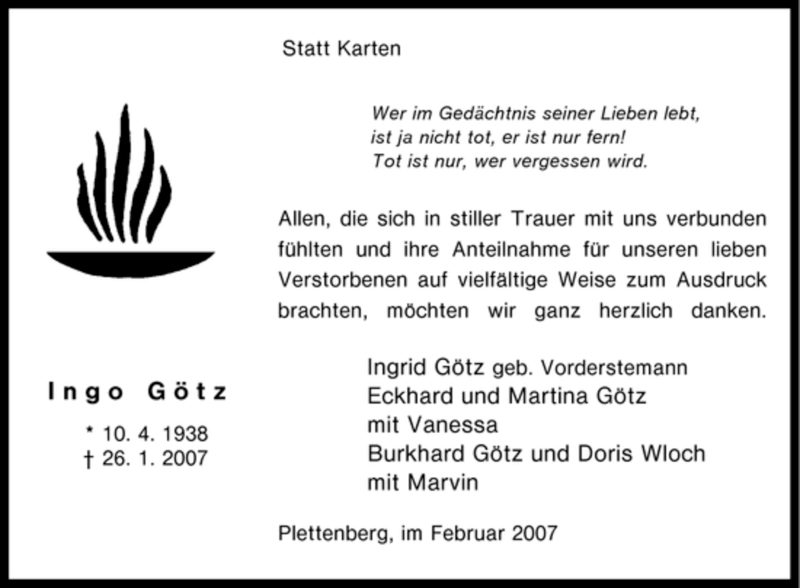 Hier finden Sie alle Traueranzeigen aus der Zeitung, die bisher für Ingo Götz erschienen sind. Weitere Traueranzeigen, die in der Zeitung erscheinen, werden hier ebenfalls aufgelistet