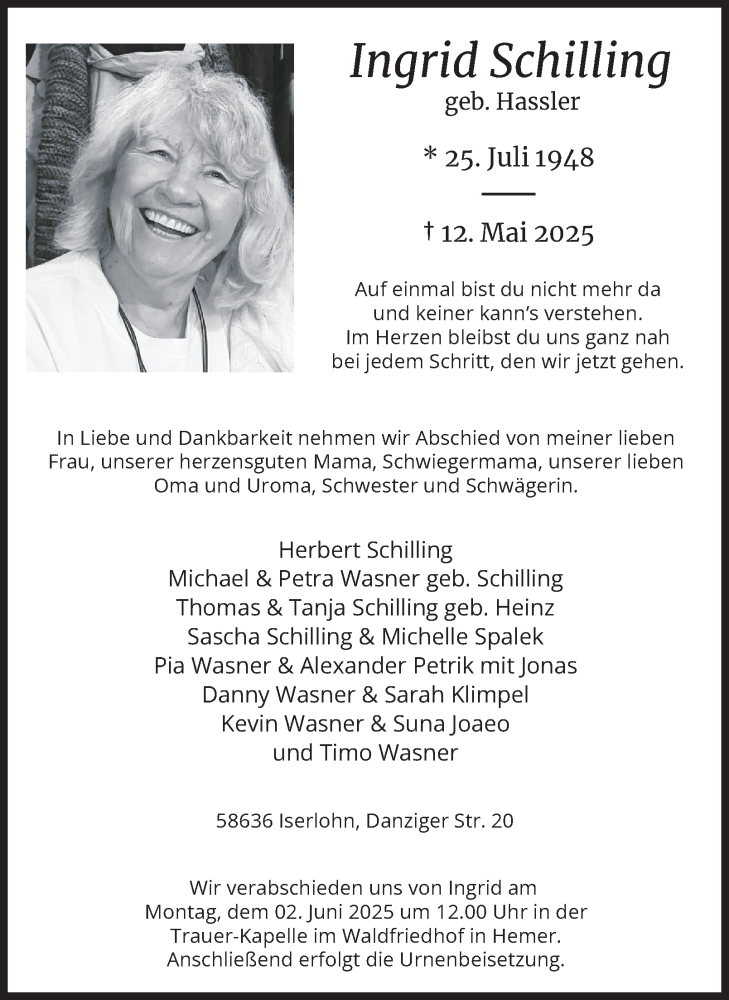 Hier finden Sie alle Traueranzeigen aus der Zeitung, die bisher für Ingrid Schilling erschienen sind. Weitere Traueranzeigen, die in der Zeitung erscheinen, werden hier ebenfalls aufgelistet