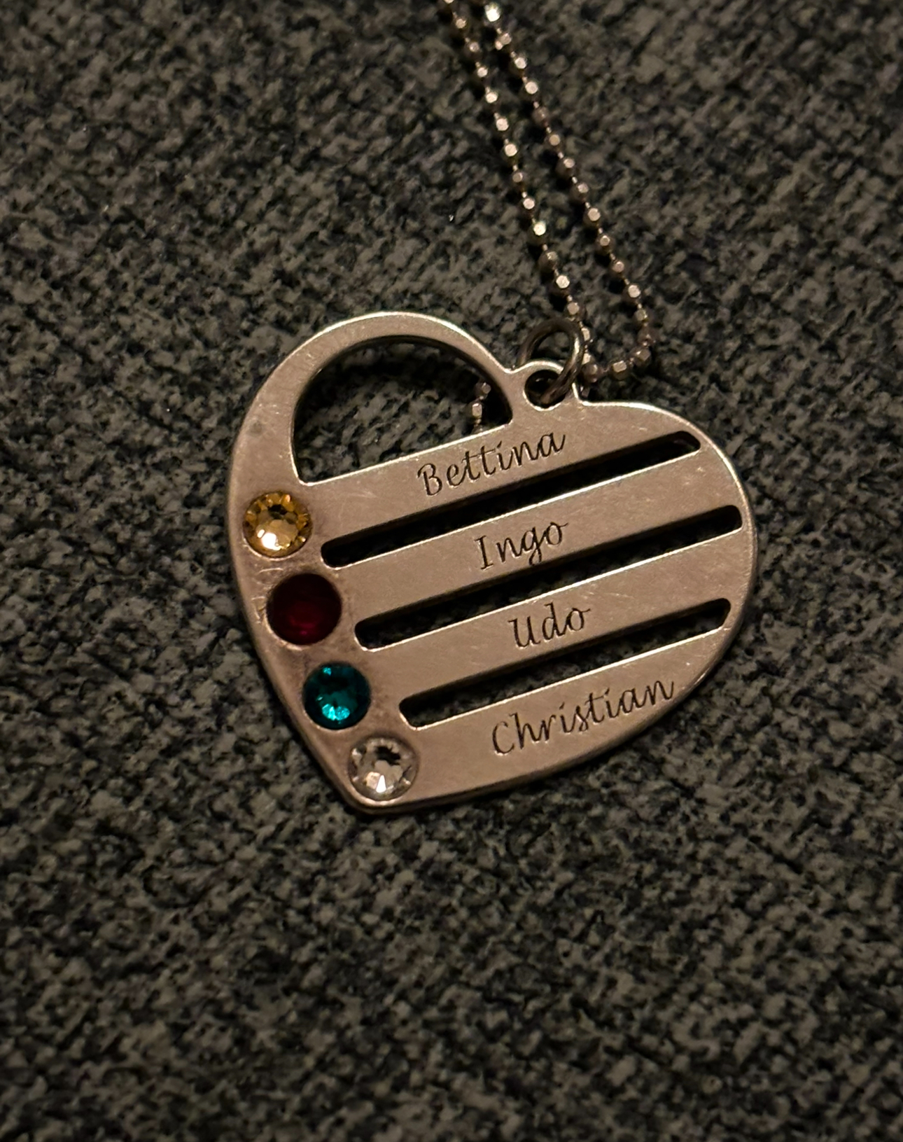 Diese Kette, die wir Mutti vor vielen Jahren zum Muttertag schenkten, begleitet sie morgen ins Grab. Wir dürfen die Kette in die Schmuck-Urne legen.